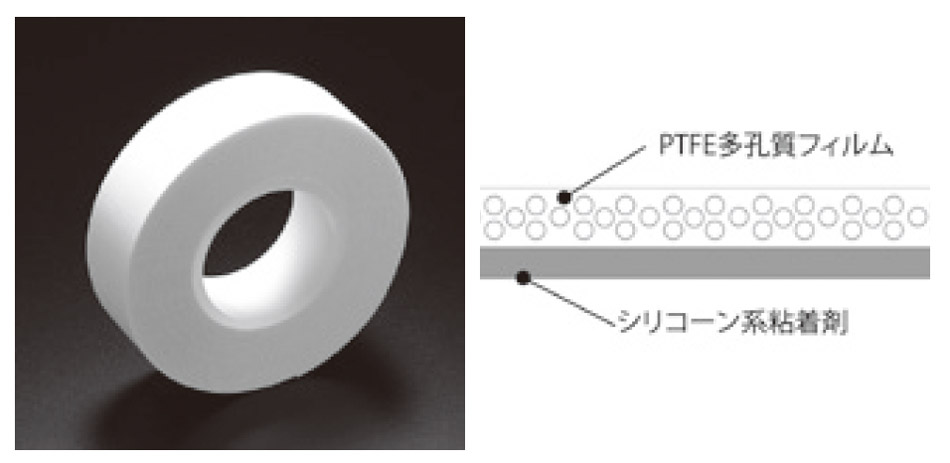 “多孔質”とは多くの細孔(細かな穴)があることを表し、フッ素樹脂の特性を保持しながら、通気性と撥水性を兼ね備えた物のことです。「液体は通したくないが気体は通したい」「保温したい」「クッション性を持たせたい」などの用途にもってこいの製品です。